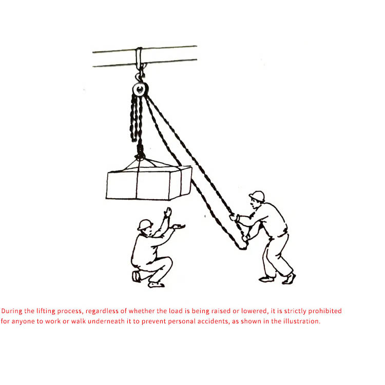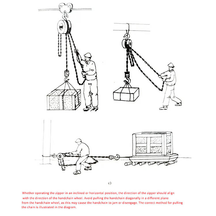 Correct Pulling: Pull the hand chain smoothly and vertically along the chain direction; do not pull at an angle or have multiple people pull forcefully.